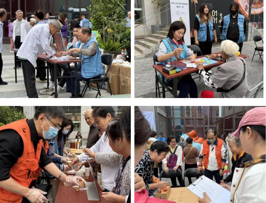 党员先锋在行动 细微之处显担当。活动现场,党员志愿者们身着统一志愿者马甲,在试吃区、游戏区、物资区等岗位各司其职,用行动传递温暖。引导岗上,他们悉心引导、耐心讲解活动规则,主动维持现场秩序、及时疏导人流,确保各游戏区域与互动环节衔接顺畅。物资区里,志愿者们则认真清点奖品数量、分类整理物料,并根据需求快速分发,确保每一份小礼品都能及时送到参与者手中。游戏区中,志愿者们化身“游戏引导员”,鼓励老人们大胆尝试——“阿姨,这个拼图您试试看,我帮您一起拼!”“爷爷,用整个手掌拍球更容易,肯定能得分!”,在一句句暖心鼓励下,大家的参与热情愈发高涨。试吃区里,他们主动搀扶行动不便的老人就座,细心递上餐盘,耐心介绍试吃食品的特点,与老人们亲切唠起家常,现场洋溢着温馨的氛围。各个区域的志愿者们紧密配合,共同营造了有序又温馨的活动氛围。